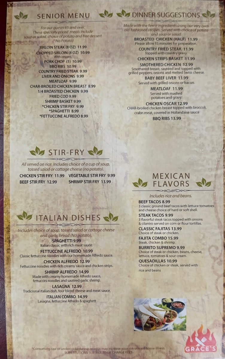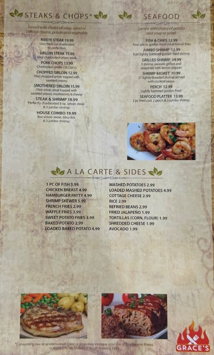 Whether you’re enjoying breakfast classics like fluffy pancakes or lunch specials, each dish is crafted with care to ensure quality and satisfaction. With attentive service and generous portions, Grace's Restaurant is more than just a meal; it’s an experience worth savoring.